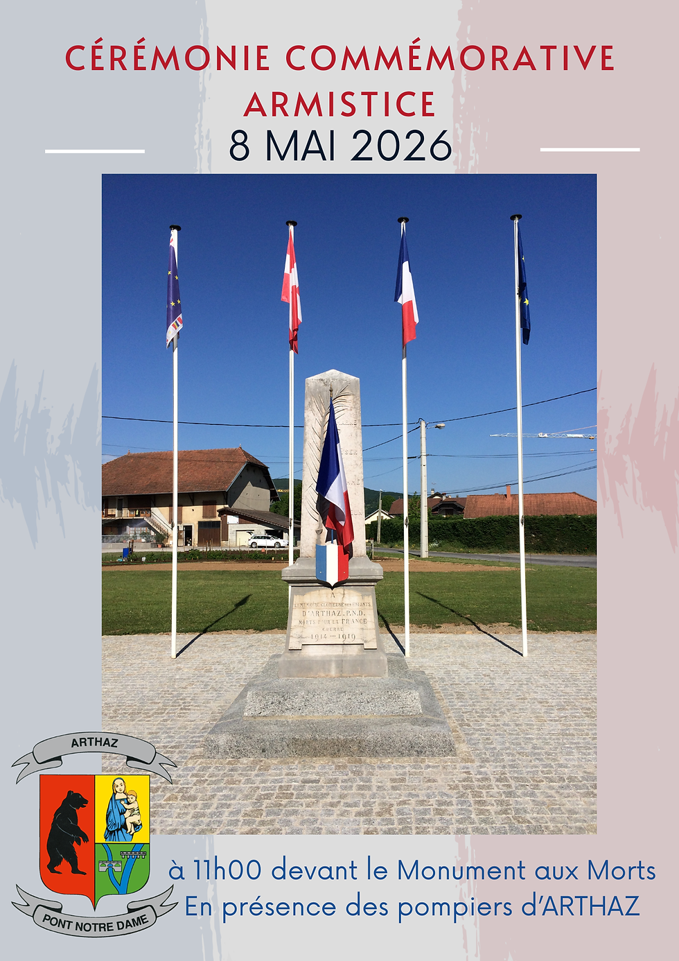 Vous êtes conviés le vendredi 8 mai 2026 à 11h00, devant le Monument aux Morts d'Arthaz PND, pour un moment de recueillement et d'hommage à tous les morts pour la France, à l'occasion de la cérémonie commémorative de l'Armistice du 8 mai 1945.